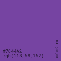 Цвет #7644A2 в цветовой модели RGB обозначается тремя октетами (118, 68, 162) в десятичном формате и #7644A2 в шестнадцатиричном (hex) формате, которые являются интенсивностью красного 118 (hex 76), интенсивность зелёного 68 (hex 44) и интенсивность синего 162 (hex A2).