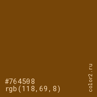 Цвет #764508 в цветовой модели RGB обозначается тремя октетами (118, 69, 8) в десятичном формате и #764508 в шестнадцатиричном (hex) формате, которые являются интенсивностью красного 118 (hex 76), интенсивность зелёного 69 (hex 45) и интенсивность синего 8 (hex 08).