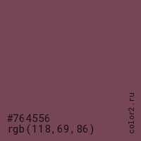Цвет #764556 в цветовой модели RGB обозначается тремя октетами (118, 69, 86) в десятичном формате и #764556 в шестнадцатиричном (hex) формате, которые являются интенсивностью красного 118 (hex 76), интенсивность зелёного 69 (hex 45) и интенсивность синего 86 (hex 56).