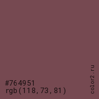 Цвет #764951 в цветовой модели RGB обозначается тремя октетами (118, 73, 81) в десятичном формате и #764951 в шестнадцатиричном (hex) формате, которые являются интенсивностью красного 118 (hex 76), интенсивность зелёного 73 (hex 49) и интенсивность синего 81 (hex 51).