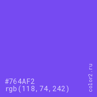 Цвет #764AF2 в цветовой модели RGB обозначается тремя октетами (118, 74, 242) в десятичном формате и #764AF2 в шестнадцатиричном (hex) формате, которые являются интенсивностью красного 118 (hex 76), интенсивность зелёного 74 (hex 4A) и интенсивность синего 242 (hex F2).