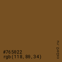 Цвет #765022 в цветовой модели RGB обозначается тремя октетами (118, 80, 34) в десятичном формате и #765022 в шестнадцатиричном (hex) формате, которые являются интенсивностью красного 118 (hex 76), интенсивность зелёного 80 (hex 50) и интенсивность синего 34 (hex 22).