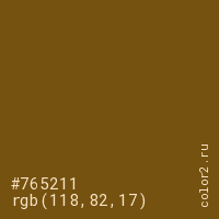 Цвет #765211 в цветовой модели RGB обозначается тремя октетами (118, 82, 17) в десятичном формате и #765211 в шестнадцатиричном (hex) формате, которые являются интенсивностью красного 118 (hex 76), интенсивность зелёного 82 (hex 52) и интенсивность синего 17 (hex 11).