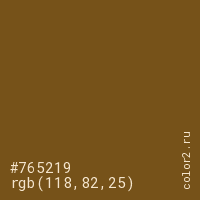 Цвет #765219 в цветовой модели RGB обозначается тремя октетами (118, 82, 25) в десятичном формате и #765219 в шестнадцатиричном (hex) формате, которые являются интенсивностью красного 118 (hex 76), интенсивность зелёного 82 (hex 52) и интенсивность синего 25 (hex 19).
