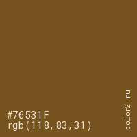 Цвет #76531F в цветовой модели RGB обозначается тремя октетами (118, 83, 31) в десятичном формате и #76531F в шестнадцатиричном (hex) формате, которые являются интенсивностью красного 118 (hex 76), интенсивность зелёного 83 (hex 53) и интенсивность синего 31 (hex 1F).