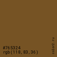 Цвет #765324 в цветовой модели RGB обозначается тремя октетами (118, 83, 36) в десятичном формате и #765324 в шестнадцатиричном (hex) формате, которые являются интенсивностью красного 118 (hex 76), интенсивность зелёного 83 (hex 53) и интенсивность синего 36 (hex 24).