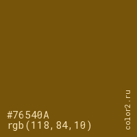 Цвет #76540A в цветовой модели RGB обозначается тремя октетами (118, 84, 10) в десятичном формате и #76540A в шестнадцатиричном (hex) формате, которые являются интенсивностью красного 118 (hex 76), интенсивность зелёного 84 (hex 54) и интенсивность синего 10 (hex 0A).