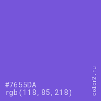 Цвет #7655DA в цветовой модели RGB обозначается тремя октетами (118, 85, 218) в десятичном формате и #7655DA в шестнадцатиричном (hex) формате, которые являются интенсивностью красного 118 (hex 76), интенсивность зелёного 85 (hex 55) и интенсивность синего 218 (hex DA).