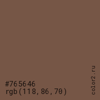 Цвет #765646 в цветовой модели RGB обозначается тремя октетами (118, 86, 70) в десятичном формате и #765646 в шестнадцатиричном (hex) формате, которые являются интенсивностью красного 118 (hex 76), интенсивность зелёного 86 (hex 56) и интенсивность синего 70 (hex 46).