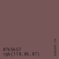 Цвет #765657 в цветовой модели RGB обозначается тремя октетами (118, 86, 87) в десятичном формате и #765657 в шестнадцатиричном (hex) формате, которые являются интенсивностью красного 118 (hex 76), интенсивность зелёного 86 (hex 56) и интенсивность синего 87 (hex 57).