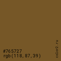 Цвет #765727 в цветовой модели RGB обозначается тремя октетами (118, 87, 39) в десятичном формате и #765727 в шестнадцатиричном (hex) формате, которые являются интенсивностью красного 118 (hex 76), интенсивность зелёного 87 (hex 57) и интенсивность синего 39 (hex 27).