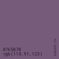 Цвет #765B7B в цветовой модели RGB обозначается тремя октетами (118, 91, 123) в десятичном формате и #765B7B в шестнадцатиричном (hex) формате, которые являются интенсивностью красного 118 (hex 76), интенсивность зелёного 91 (hex 5B) и интенсивность синего 123 (hex 7B).