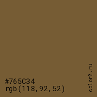 Цвет #765C34 в цветовой модели RGB обозначается тремя октетами (118, 92, 52) в десятичном формате и #765C34 в шестнадцатиричном (hex) формате, которые являются интенсивностью красного 118 (hex 76), интенсивность зелёного 92 (hex 5C) и интенсивность синего 52 (hex 34).
