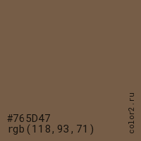 Цвет #765D47 в цветовой модели RGB обозначается тремя октетами (118, 93, 71) в десятичном формате и #765D47 в шестнадцатиричном (hex) формате, которые являются интенсивностью красного 118 (hex 76), интенсивность зелёного 93 (hex 5D) и интенсивность синего 71 (hex 47).
