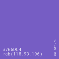 Цвет #765DC4 в цветовой модели RGB обозначается тремя октетами (118, 93, 196) в десятичном формате и #765DC4 в шестнадцатиричном (hex) формате, которые являются интенсивностью красного 118 (hex 76), интенсивность зелёного 93 (hex 5D) и интенсивность синего 196 (hex C4).