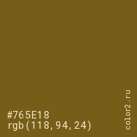 Цвет #765E18 в цветовой модели RGB обозначается тремя октетами (118, 94, 24) в десятичном формате и #765E18 в шестнадцатиричном (hex) формате, которые являются интенсивностью красного 118 (hex 76), интенсивность зелёного 94 (hex 5E) и интенсивность синего 24 (hex 18).