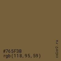 Цвет #765F3B в цветовой модели RGB обозначается тремя октетами (118, 95, 59) в десятичном формате и #765F3B в шестнадцатиричном (hex) формате, которые являются интенсивностью красного 118 (hex 76), интенсивность зелёного 95 (hex 5F) и интенсивность синего 59 (hex 3B).