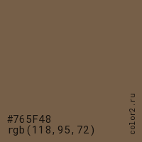 Цвет #765F48 в цветовой модели RGB обозначается тремя октетами (118, 95, 72) в десятичном формате и #765F48 в шестнадцатиричном (hex) формате, которые являются интенсивностью красного 118 (hex 76), интенсивность зелёного 95 (hex 5F) и интенсивность синего 72 (hex 48).