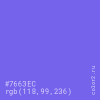 Цвет #7663EC в цветовой модели RGB обозначается тремя октетами (118, 99, 236) в десятичном формате и #7663EC в шестнадцатиричном (hex) формате, которые являются интенсивностью красного 118 (hex 76), интенсивность зелёного 99 (hex 63) и интенсивность синего 236 (hex EC).