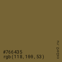 Цвет #766435 в цветовой модели RGB обозначается тремя октетами (118, 100, 53) в десятичном формате и #766435 в шестнадцатиричном (hex) формате, которые являются интенсивностью красного 118 (hex 76), интенсивность зелёного 100 (hex 64) и интенсивность синего 53 (hex 35).