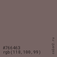 Цвет #766463 в цветовой модели RGB обозначается тремя октетами (118, 100, 99) в десятичном формате и #766463 в шестнадцатиричном (hex) формате, которые являются интенсивностью красного 118 (hex 76), интенсивность зелёного 100 (hex 64) и интенсивность синего 99 (hex 63).