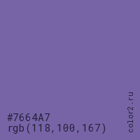 Цвет #7664A7 в цветовой модели RGB обозначается тремя октетами (118, 100, 167) в десятичном формате и #7664A7 в шестнадцатиричном (hex) формате, которые являются интенсивностью красного 118 (hex 76), интенсивность зелёного 100 (hex 64) и интенсивность синего 167 (hex A7).