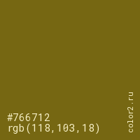 Цвет #766712 в цветовой модели RGB обозначается тремя октетами (118, 103, 18) в десятичном формате и #766712 в шестнадцатиричном (hex) формате, которые являются интенсивностью красного 118 (hex 76), интенсивность зелёного 103 (hex 67) и интенсивность синего 18 (hex 12).