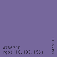 Цвет #76679C в цветовой модели RGB обозначается тремя октетами (118, 103, 156) в десятичном формате и #76679C в шестнадцатиричном (hex) формате, которые являются интенсивностью красного 118 (hex 76), интенсивность зелёного 103 (hex 67) и интенсивность синего 156 (hex 9C).