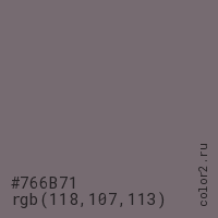 Цвет #766B71 в цветовой модели RGB обозначается тремя октетами (118, 107, 113) в десятичном формате и #766B71 в шестнадцатиричном (hex) формате, которые являются интенсивностью красного 118 (hex 76), интенсивность зелёного 107 (hex 6B) и интенсивность синего 113 (hex 71).