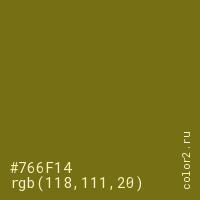 Цвет #766F14 в цветовой модели RGB обозначается тремя октетами (118, 111, 20) в десятичном формате и #766F14 в шестнадцатиричном (hex) формате, которые являются интенсивностью красного 118 (hex 76), интенсивность зелёного 111 (hex 6F) и интенсивность синего 20 (hex 14).