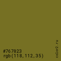 Цвет #767023 в цветовой модели RGB обозначается тремя октетами (118, 112, 35) в десятичном формате и #767023 в шестнадцатиричном (hex) формате, которые являются интенсивностью красного 118 (hex 76), интенсивность зелёного 112 (hex 70) и интенсивность синего 35 (hex 23).
