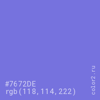 Цвет #7672DE в цветовой модели RGB обозначается тремя октетами (118, 114, 222) в десятичном формате и #7672DE в шестнадцатиричном (hex) формате, которые являются интенсивностью красного 118 (hex 76), интенсивность зелёного 114 (hex 72) и интенсивность синего 222 (hex DE).