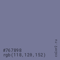 Цвет #767898 в цветовой модели RGB обозначается тремя октетами (118, 120, 152) в десятичном формате и #767898 в шестнадцатиричном (hex) формате, которые являются интенсивностью красного 118 (hex 76), интенсивность зелёного 120 (hex 78) и интенсивность синего 152 (hex 98).