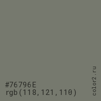 Цвет #76796E в цветовой модели RGB обозначается тремя октетами (118, 121, 110) в десятичном формате и #76796E в шестнадцатиричном (hex) формате, которые являются интенсивностью красного 118 (hex 76), интенсивность зелёного 121 (hex 79) и интенсивность синего 110 (hex 6E).
