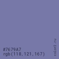 Цвет #7679A7 в цветовой модели RGB обозначается тремя октетами (118, 121, 167) в десятичном формате и #7679A7 в шестнадцатиричном (hex) формате, которые являются интенсивностью красного 118 (hex 76), интенсивность зелёного 121 (hex 79) и интенсивность синего 167 (hex A7).