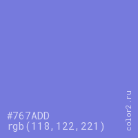 Цвет #767ADD в цветовой модели RGB обозначается тремя октетами (118, 122, 221) в десятичном формате и #767ADD в шестнадцатиричном (hex) формате, которые являются интенсивностью красного 118 (hex 76), интенсивность зелёного 122 (hex 7A) и интенсивность синего 221 (hex DD).