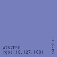 Цвет #767FBC в цветовой модели RGB обозначается тремя октетами (118, 127, 188) в десятичном формате и #767FBC в шестнадцатиричном (hex) формате, которые являются интенсивностью красного 118 (hex 76), интенсивность зелёного 127 (hex 7F) и интенсивность синего 188 (hex BC).