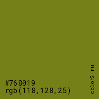 Цвет #768019 в цветовой модели RGB обозначается тремя октетами (118, 128, 25) в десятичном формате и #768019 в шестнадцатиричном (hex) формате, которые являются интенсивностью красного 118 (hex 76), интенсивность зелёного 128 (hex 80) и интенсивность синего 25 (hex 19).