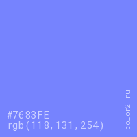 Цвет #7683FE в цветовой модели RGB обозначается тремя октетами (118, 131, 254) в десятичном формате и #7683FE в шестнадцатиричном (hex) формате, которые являются интенсивностью красного 118 (hex 76), интенсивность зелёного 131 (hex 83) и интенсивность синего 254 (hex FE).