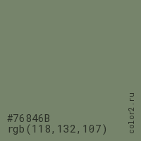 Цвет #76846B в цветовой модели RGB обозначается тремя октетами (118, 132, 107) в десятичном формате и #76846B в шестнадцатиричном (hex) формате, которые являются интенсивностью красного 118 (hex 76), интенсивность зелёного 132 (hex 84) и интенсивность синего 107 (hex 6B).