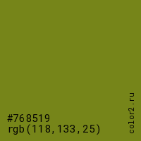 Цвет #768519 в цветовой модели RGB обозначается тремя октетами (118, 133, 25) в десятичном формате и #768519 в шестнадцатиричном (hex) формате, которые являются интенсивностью красного 118 (hex 76), интенсивность зелёного 133 (hex 85) и интенсивность синего 25 (hex 19).