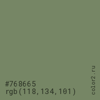 Цвет #768665 в цветовой модели RGB обозначается тремя октетами (118, 134, 101) в десятичном формате и #768665 в шестнадцатиричном (hex) формате, которые являются интенсивностью красного 118 (hex 76), интенсивность зелёного 134 (hex 86) и интенсивность синего 101 (hex 65).