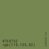 Цвет #768752 в цветовой модели RGB обозначается тремя октетами (118, 135, 82) в десятичном формате и #768752 в шестнадцатиричном (hex) формате, которые являются интенсивностью красного 118 (hex 76), интенсивность зелёного 135 (hex 87) и интенсивность синего 82 (hex 52).