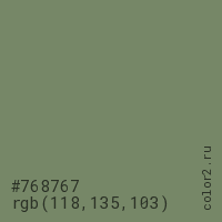 Цвет #768767 в цветовой модели RGB обозначается тремя октетами (118, 135, 103) в десятичном формате и #768767 в шестнадцатиричном (hex) формате, которые являются интенсивностью красного 118 (hex 76), интенсивность зелёного 135 (hex 87) и интенсивность синего 103 (hex 67).