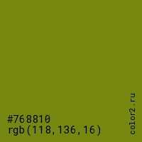 Цвет #768810 в цветовой модели RGB обозначается тремя октетами (118, 136, 16) в десятичном формате и #768810 в шестнадцатиричном (hex) формате, которые являются интенсивностью красного 118 (hex 76), интенсивность зелёного 136 (hex 88) и интенсивность синего 16 (hex 10).