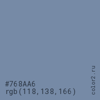 Цвет #768AA6 в цветовой модели RGB обозначается тремя октетами (118, 138, 166) в десятичном формате и #768AA6 в шестнадцатиричном (hex) формате, которые являются интенсивностью красного 118 (hex 76), интенсивность зелёного 138 (hex 8A) и интенсивность синего 166 (hex A6).