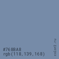 Цвет #768BA8 в цветовой модели RGB обозначается тремя октетами (118, 139, 168) в десятичном формате и #768BA8 в шестнадцатиричном (hex) формате, которые являются интенсивностью красного 118 (hex 76), интенсивность зелёного 139 (hex 8B) и интенсивность синего 168 (hex A8).