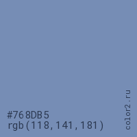Цвет #768DB5 в цветовой модели RGB обозначается тремя октетами (118, 141, 181) в десятичном формате и #768DB5 в шестнадцатиричном (hex) формате, которые являются интенсивностью красного 118 (hex 76), интенсивность зелёного 141 (hex 8D) и интенсивность синего 181 (hex B5).