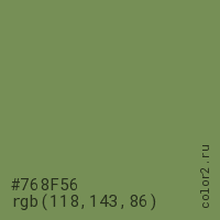 Цвет #768F56 в цветовой модели RGB обозначается тремя октетами (118, 143, 86) в десятичном формате и #768F56 в шестнадцатиричном (hex) формате, которые являются интенсивностью красного 118 (hex 76), интенсивность зелёного 143 (hex 8F) и интенсивность синего 86 (hex 56).