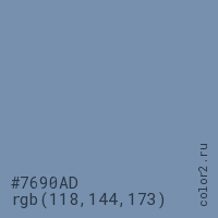 Цвет #7690AD в цветовой модели RGB обозначается тремя октетами (118, 144, 173) в десятичном формате и #7690AD в шестнадцатиричном (hex) формате, которые являются интенсивностью красного 118 (hex 76), интенсивность зелёного 144 (hex 90) и интенсивность синего 173 (hex AD).